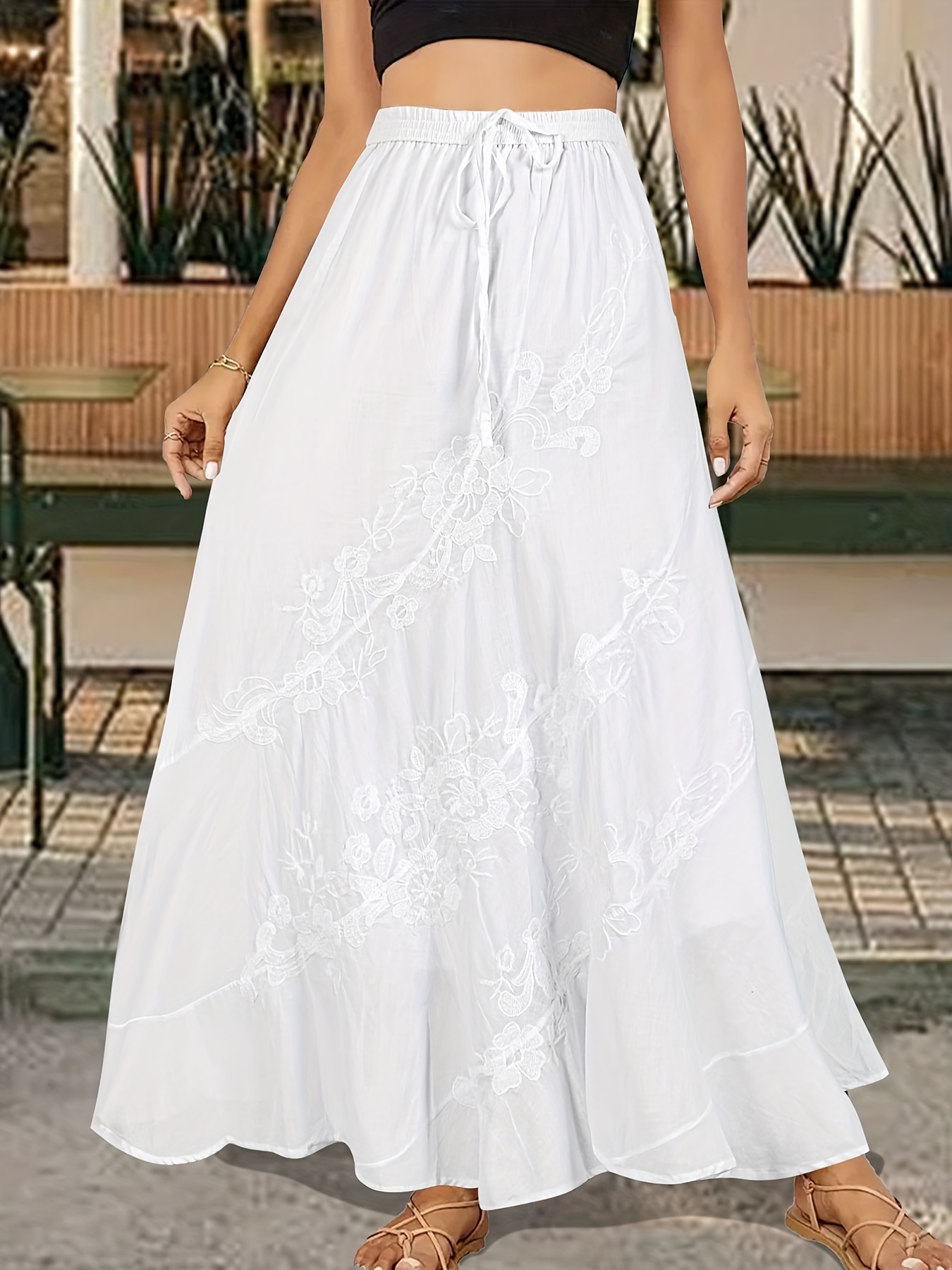 Solid Drawstring Waist Skirt, Elegant Beach Wear Swing Skirt For Spring & Summer, Women's Clothing