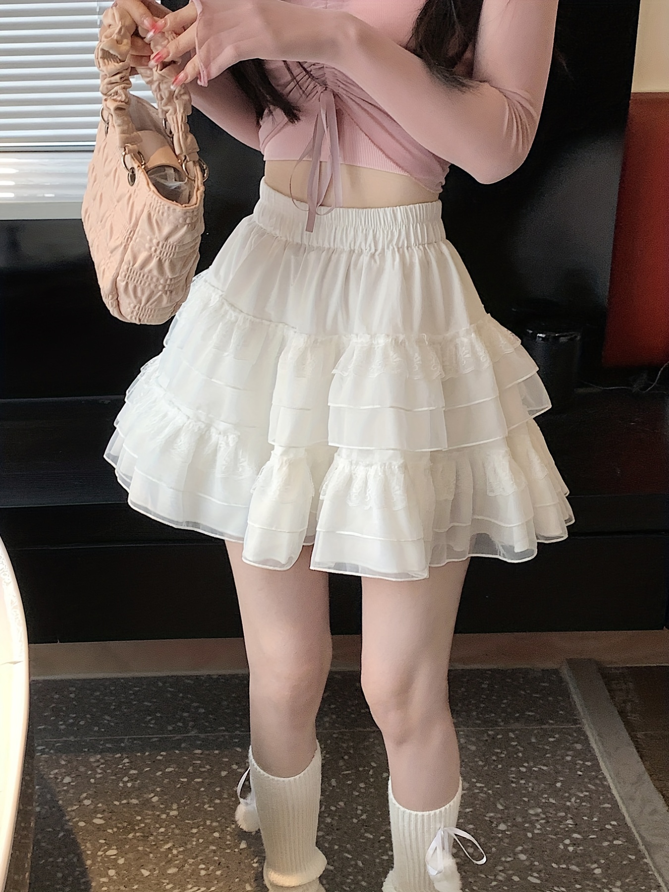 Kawaii Lace Decor Tiered Mini Skirt, Elastic Waist Skirt For Spring & Summer, Women's Clothing
